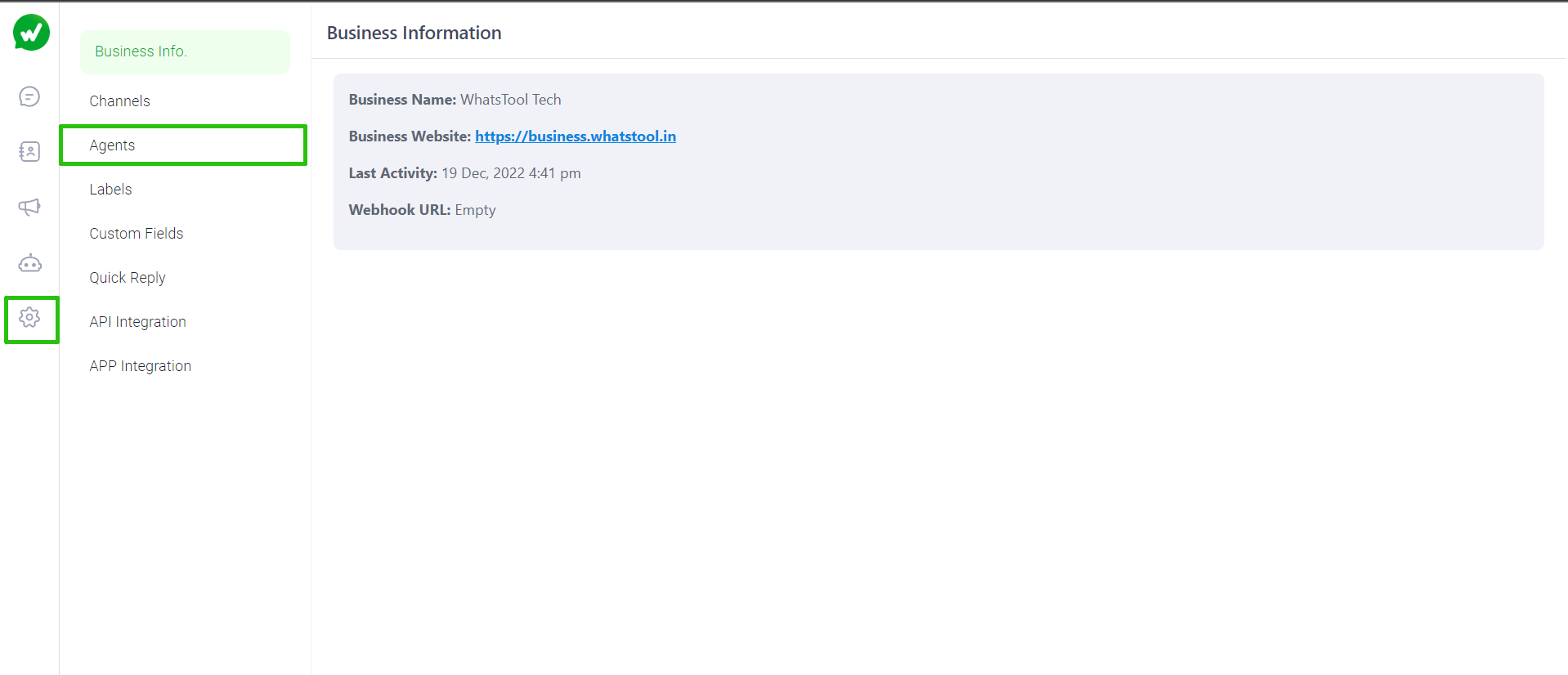 First, you must visit our website WhatsTool Business and log in to the dashboard. On the left side of the dashboard, you will find the setting option. Click on the setting option and then click on Agent