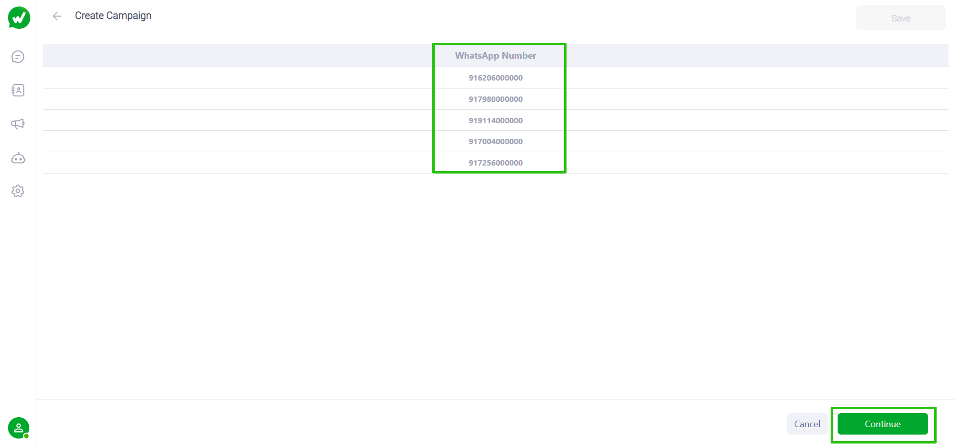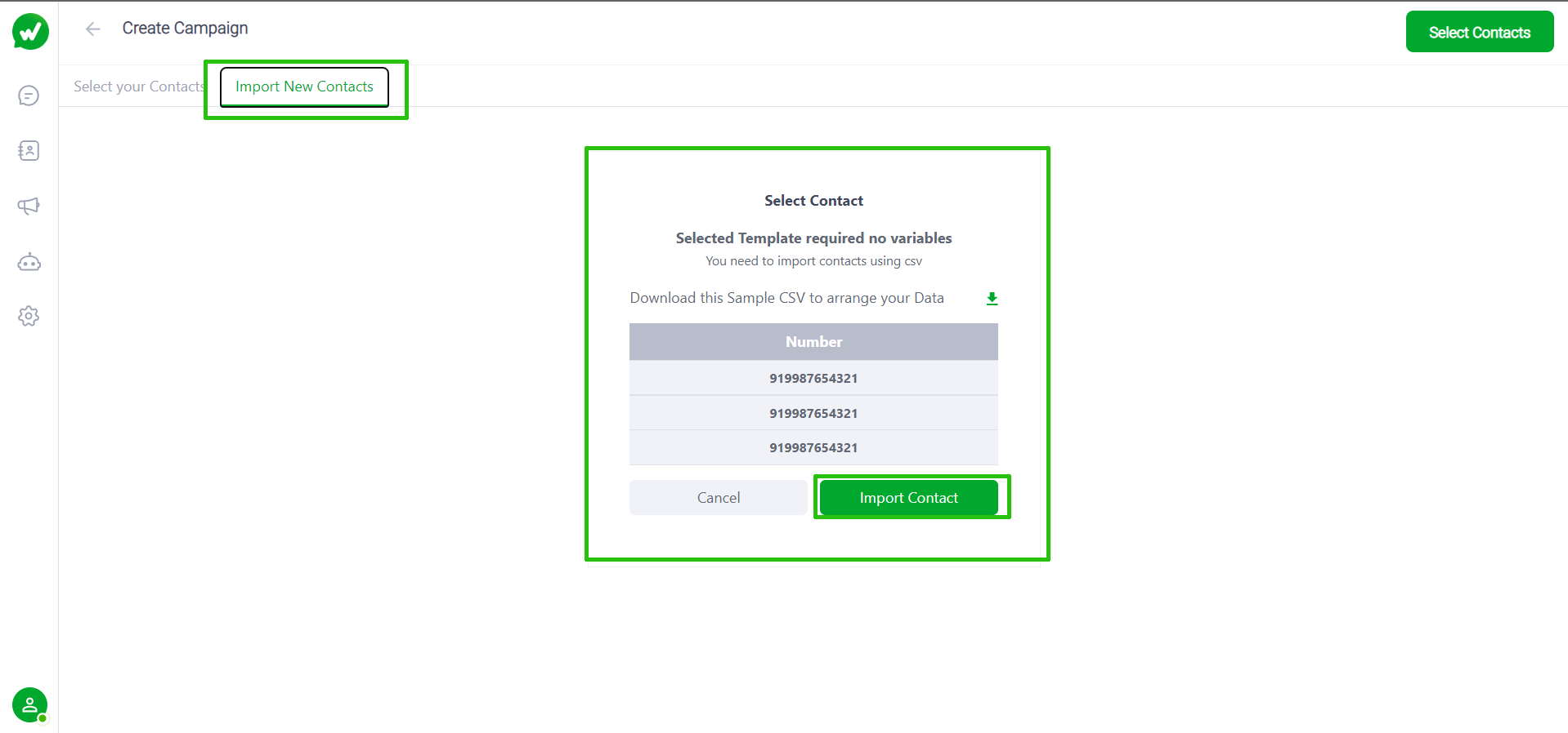 - In the contact section. you can upload a CSV file containing your customer's phone number.