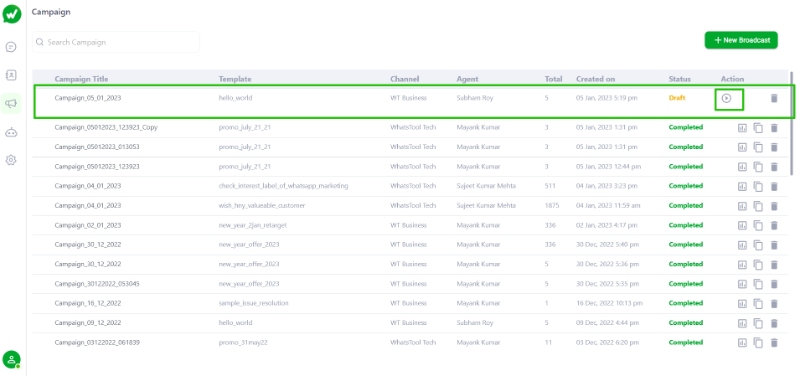 - Once you save the broadcast it will appear in the broadcast list. then you have to click on the Action button to run the campaign or broadcast