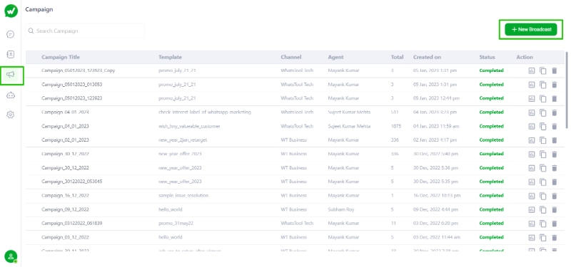 First, you need to visit our WhatsTool dashboard. then click on the broadcast option(appear on the left side). Click on the New Broadcast option on the top right side.