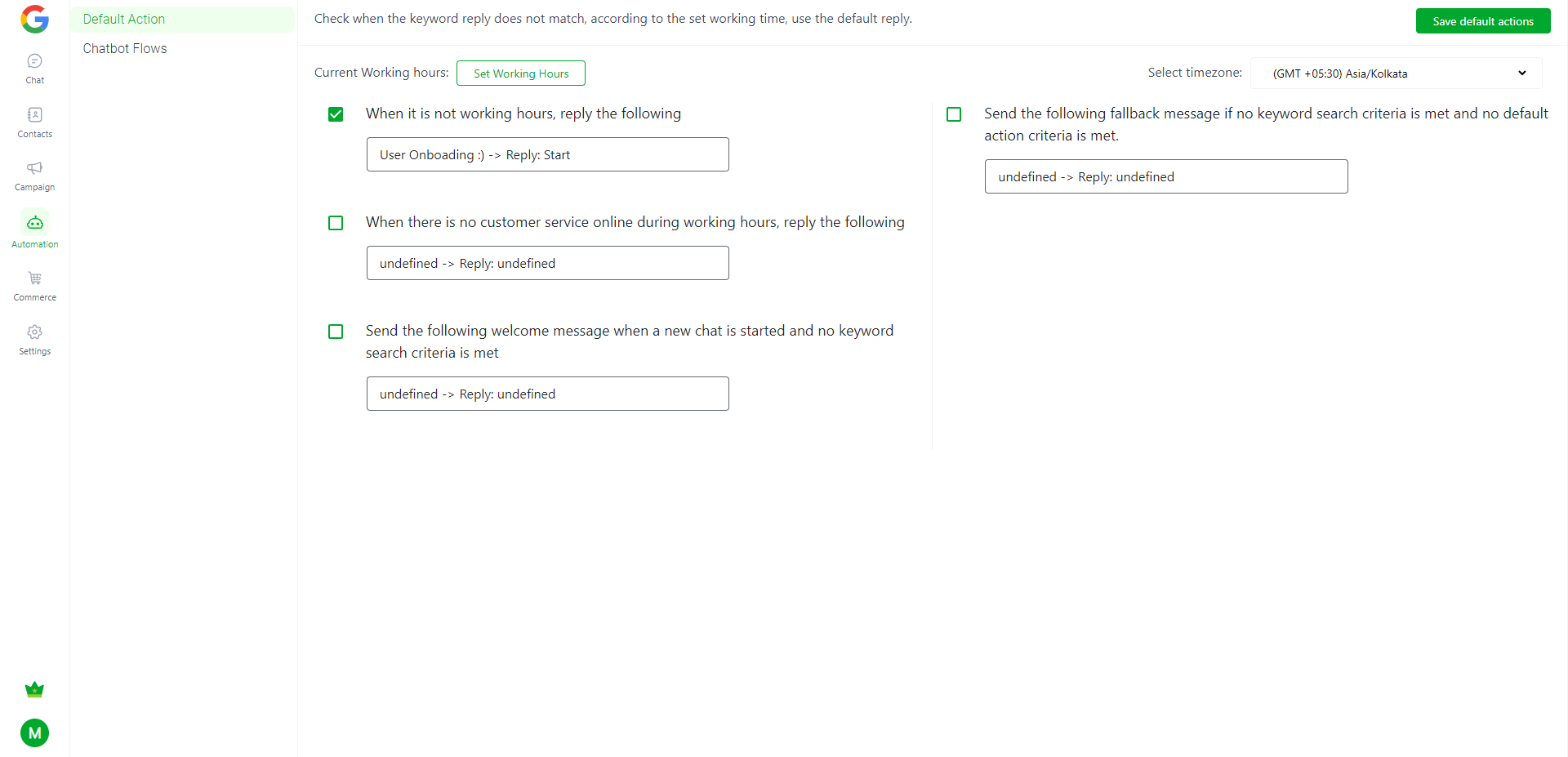 In automation, we have introduced a new section which is called default actions, where any businesses can take action as per their working hours and accordingly chatbot flow will get triggered.